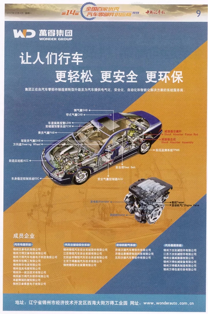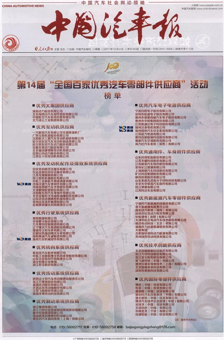 The award ceremony of Top 100 Chinese Excellent Auto Parts Suppliers was held by China Automotive News in Rugao, Jiangsu province on December 9. Four core companies of Wonder Group were selected as excellent suppliers in respective areas: Jinzhou Halla, Jinzhou Jinheng-automobile electronic appliance; Ji’nan Worldwide-engine accessories and exhaust system; Jinzhou Wanyou-drive system. This is the 4th consecutive year that Wonder wins this award since 2014.