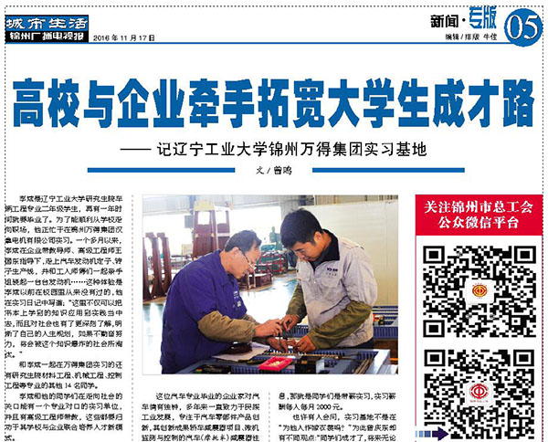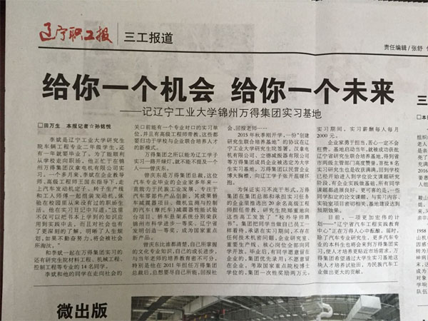日前,《遼寧職工報》和《錦州廣播電視報》分別以專欄和專板的形式,對我集團“遼寧工業(yè)大學錦州萬得集團教育實踐基地”進行了宣傳報道。