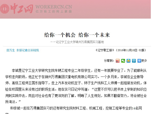 《遼寧職工報》是遼寧省總工會機關報,與《遼寧日報》同屬甲級A類報紙,全國發(fā)行!跺\州廣播電視報》由錦州廣播電視臺主辦,是具有國家統(tǒng)一刊號、遼西地區(qū)發(fā)行量最大、有效閱讀期最長的一張生活類報紙,發(fā)行覆蓋錦州全區(qū)。此次兩家報紙同時刊載的分別是由《遼寧職工報》記者孫銘悅采寫的《給你一個機會 給你一個未來》和集團《萬得資訊》編輯部采寫的長篇通訊《高校與企業(yè)牽手 拓寬大學生成才路》,“高校與企業(yè)聯(lián)合培養(yǎng)人才模式,著實為解決大學生實習難提供了一個可行性方案,同時也拓寬了大學生成才之路。目前,一項更加宏偉的計劃——‘遼寧省汽車工程實踐教育中心’正在萬得人的心中醞釀。屆時,除了汽車專業(yè)研究生,更多汽車專業(yè)的本科生也將會來到萬得集團實習,使人才培養(yǎng)更貼近市場需求。相信通過不斷努力,萬得集團大學生實習基地這塊人才培養(yǎng)試驗田,一定會結出更加豐碩成果,為民族汽車工業(yè)做出新的更大貢獻!”文章詳盡介紹了集團創(chuàng)辦教育實踐基地與遼寧工業(yè)大學聯(lián)合培養(yǎng)人才新模式。謳歌了萬得人勇于承擔社會責任的博大胸襟,展現(xiàn)了一個民營企業(yè)的時代風采。