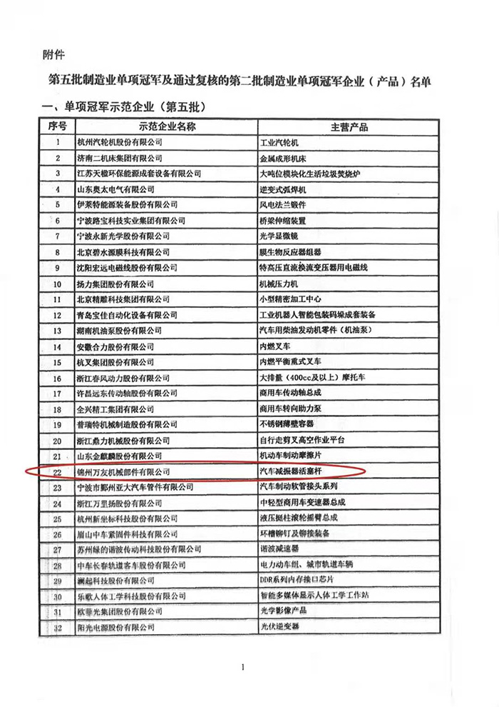 本次獲評制造業(yè)單項冠軍,是國家部委和權(quán)威行業(yè)協(xié)會對萬友公司技術(shù)創(chuàng)新、行業(yè)地位、品牌價值以及企業(yè)綜合實力的肯定,表明萬友公司已經(jīng)邁入了中國制造企業(yè)第一方陣 ,成為了“活塞桿”行業(yè)的排頭兵。